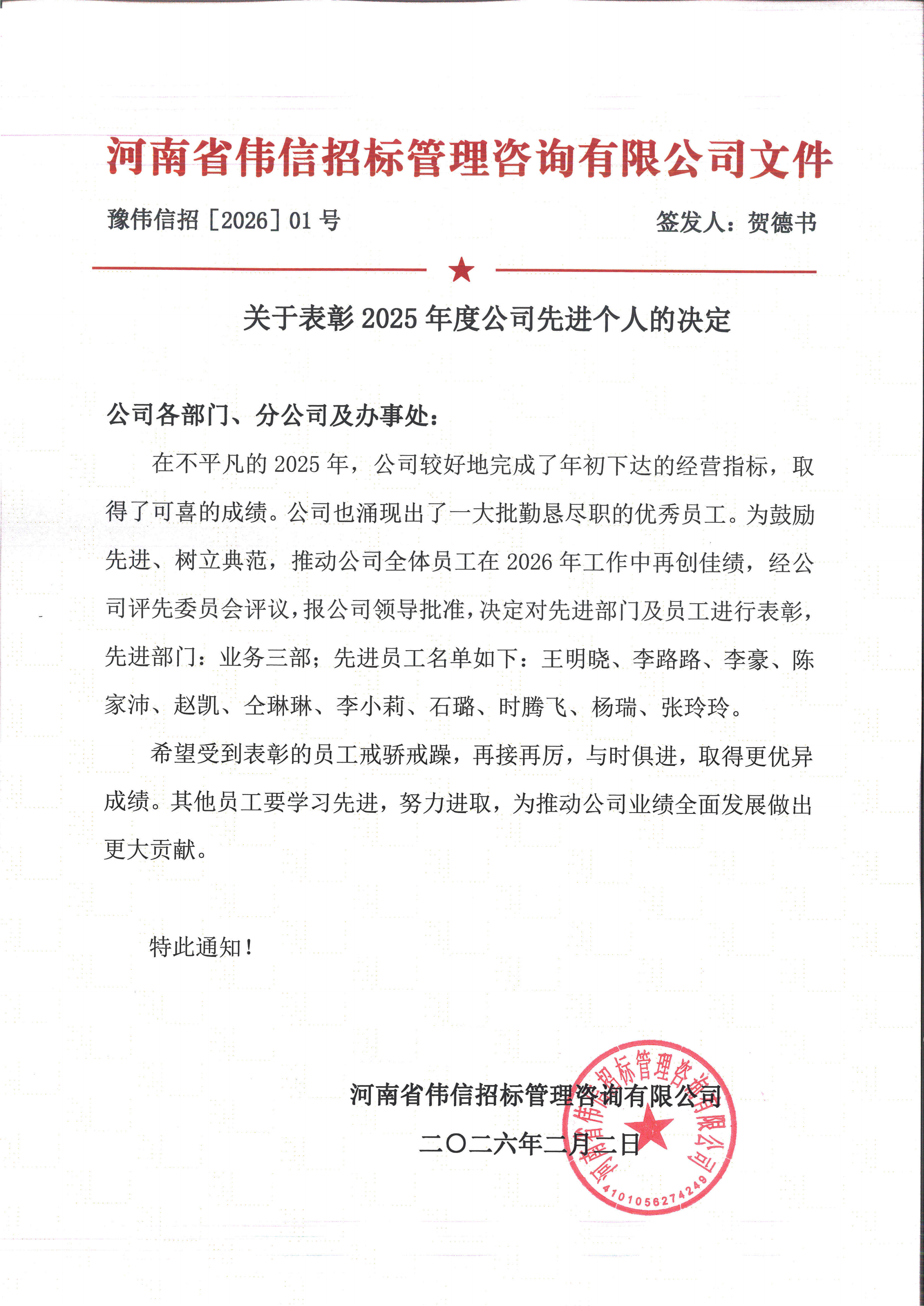 关于表彰2025年度公司先进个人的决定